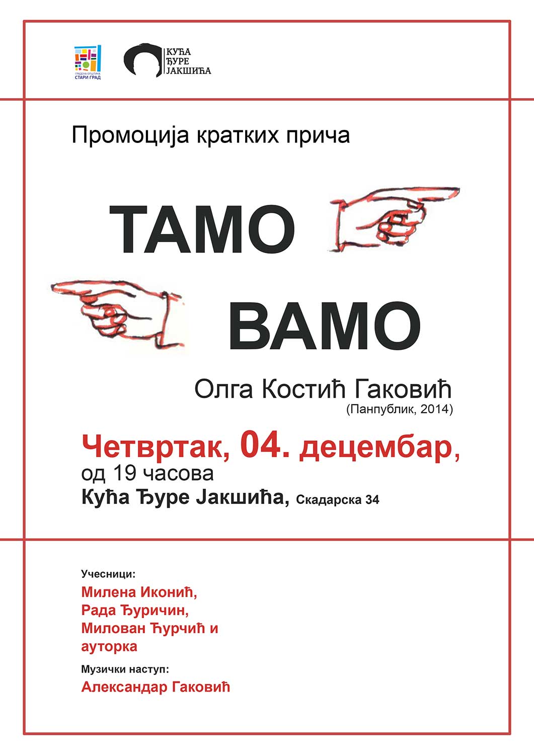 Промоција кратких прича ’’Тамо-Вамо’’ (Панпублик,2014) Београђанке из Лондона Oлге Костић Гаковић, одржаће се у четвртак, 4.12.2014. од 19 часова у Кући Ђуре Јакшића. Осим ауторке, ћерке Дивне Костић, о овом покушају да се не заборави звезда у оку старих припадника племена Керчов, икона Светог Николе и бродски сат капетана Владе Поповића из Котора, најстарији православни манастир у Великој Британији, као и мирис липа на ’’Пиазза ди фиоре’’ београдског Монмартра, говориће Милена Иконић, Рада Ђуричин и Милован Ћурчић , уз музички наступ Александра Гаковића. ’’Тамо -Амо’’посвета је пријатељима који су и овде и далеко, из периода ’’Плавог Јадрана ’’ и ’’Полета’’, када је санкање било питање престижа у мрежи чубурских улица…