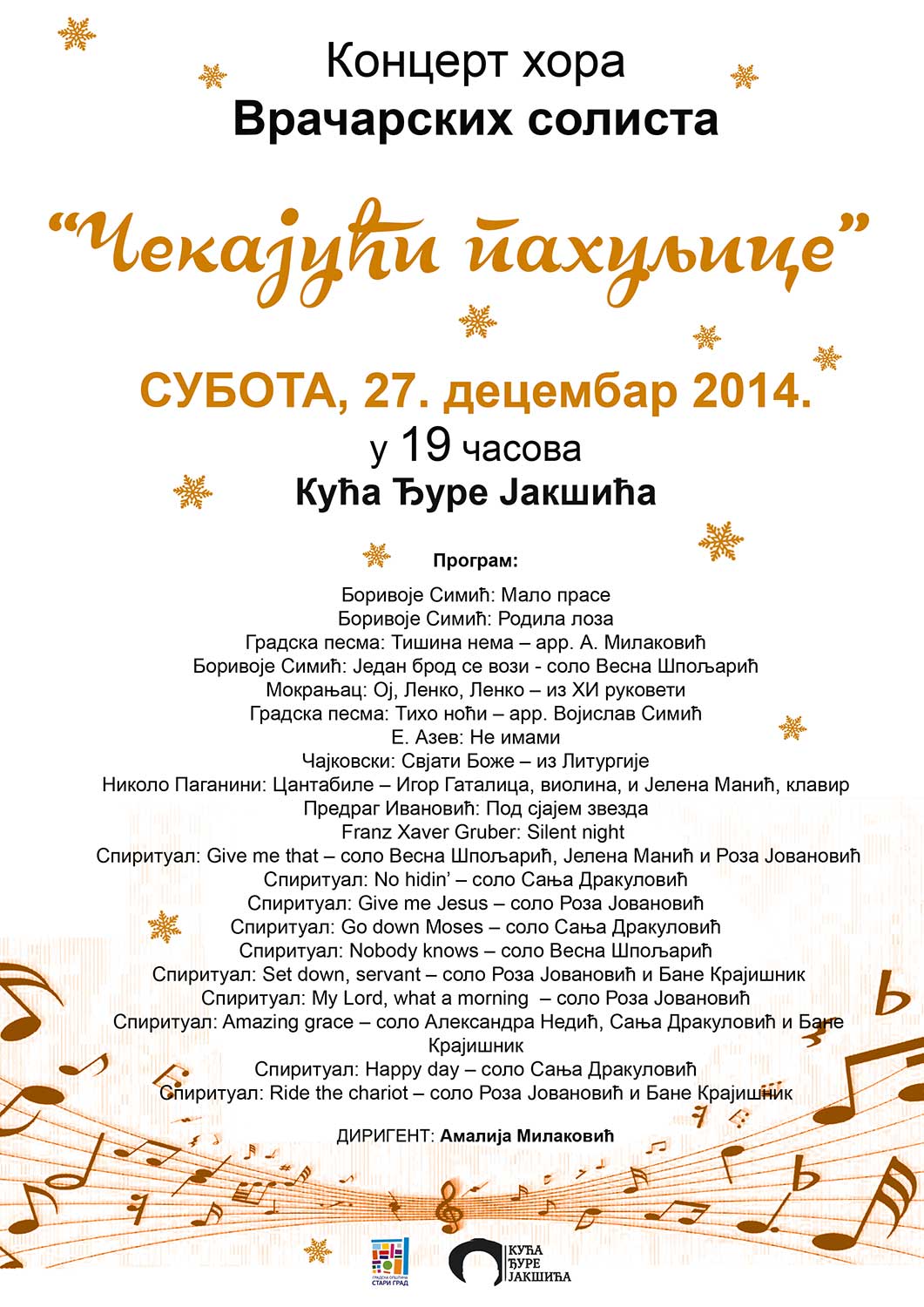 PROGRAM: Borivoje Simić: Malo prase Borivoje Simić: Rodila loza Borivoje Simić: Jedan brod se vozi – solo Vesna Špoljarić Mokranjac: Oj, Lenko, Lenko – iz XI rukoveti Gradska pesma: Tiho noći – arr. Vojislav Simić E. Azeev: Ne imami Čajkovski: Svjati Bože – iz Liturgije Nicolo Paganini: Cantabile – Igor Gatalica, violina, i Jelena Manić, klavir Predrag Ivanović: Pod sjajem zvezda Franz Xaver Gruber: Silent night Spiritual: Give me that – solo Vesna Špoljarić, Jelena Manić i Roza Jovanović Spiritual: No hidin’ – solo Sanja Drakulović Spiritual: Give me Jesus – solo Roza Jovanović Spiritual: Go down Moses – solo Sanja Drakulović Spiritual: Nobody knows – solo Vesna Špoljarić Spiritual: Set down, servant – solo Roza Jovanović i Bane Krajišnik Spiritual: My Lord, what a morning – solo Roza Jovanović Spiritual: Happy day – solo Sanja Drakulović Spiritual: Ride the chariot – solo Roza Jovanović i Bane Krajišnik Dirigent Amalija Milaković Plakat: