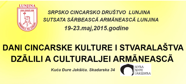 Позивамо вас да присуствујете манифестацији под називом „Дани цинцарске културе и стваралаштва“ и да сазнате нешто више о цинцарском језику и култури, као и да се упознате са традиционалном цинцарском музиком. Манифестацију ће својим наступом отворити чланови музичке секције Српско-цинцарског друштва, који ће потом заједно са музичком групом Хазари извести неке од изворних цинцарских песама, старих преко 200 година, које су и данас сачуване у истом облику у свим балкаснким земљама где живе Цинцари. Њихов наступ ће бити праћен предавањем чија ће тема бити Цинцарска изворна музика као део балканског музичког наслеђа. Другог дана манифестације ћете бити у прилици да присуствујете језичкој радионици, током које ће полазници школе цинцарског језика показати своје знање извођењем усмених и писмених вежби, након чега ће бити одржано предавање под насловом Цинцарски језик – језик романског порекла, у компарацији са словенским језицима.