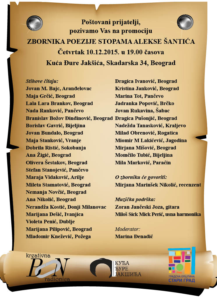 Књига ЗБОРНИК ПОЕЗИЈЕ СТОПАМА АЛЕКСЕ ШАНТИЋА настала је након конкурса на којем су учествовали песници из Србије, региона и дијаспоре. Одабрана је поезија 137 аутора. Свако од аутора, учествује у књизи на језику и писму на коме пише. Већина аутора, заступљених у зборнику су чланови националних Удружења књижевника у земљама у којима живе и стварају. Расписивањем конкурса у част великог песника Креативна радионица Балкан још једном је желела да потврди да лепа писана реч брише границе, њима се не руководи нити обазире, већ повезује и зближава ауторе широм региона и света. Песме из овог зборника су одговор из савремене перспективе на стихове који су писани пре готово једног века, али и потврда да се традиција поштује и не заборавља.