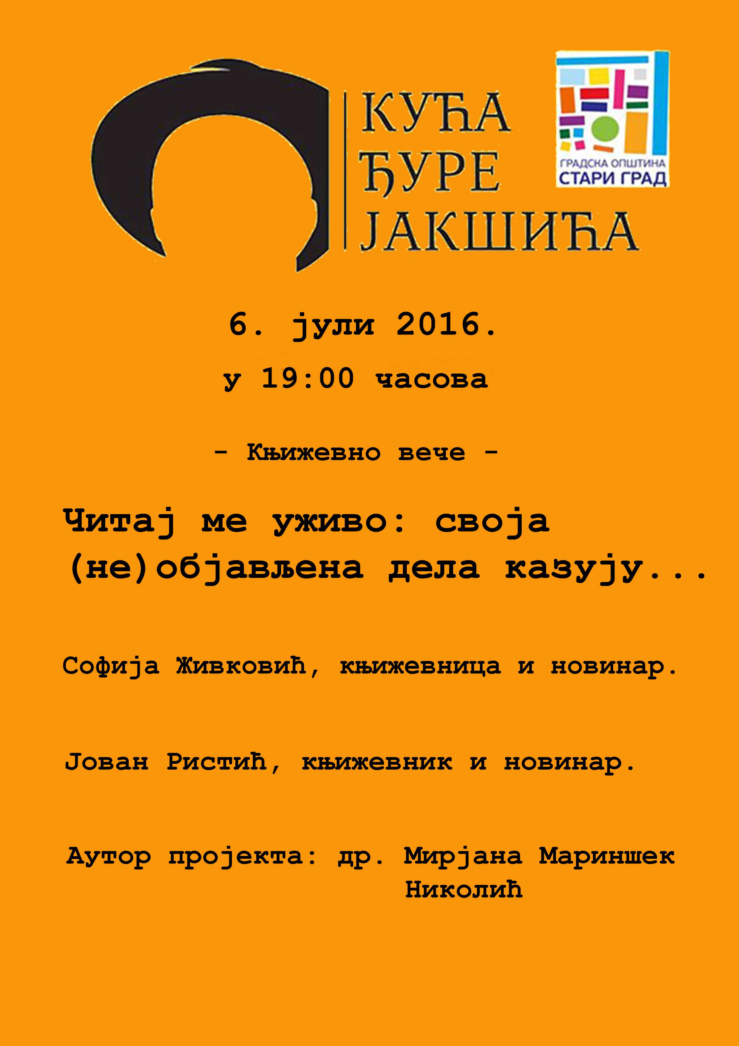 Књижевно вече „Читај ме уживо“ : своја (не) објављена дела казују Софија Живковић и Јован Ристић. Вече води М. Николић Мариншек, Среда, 06.јул 2016./ 19ч
