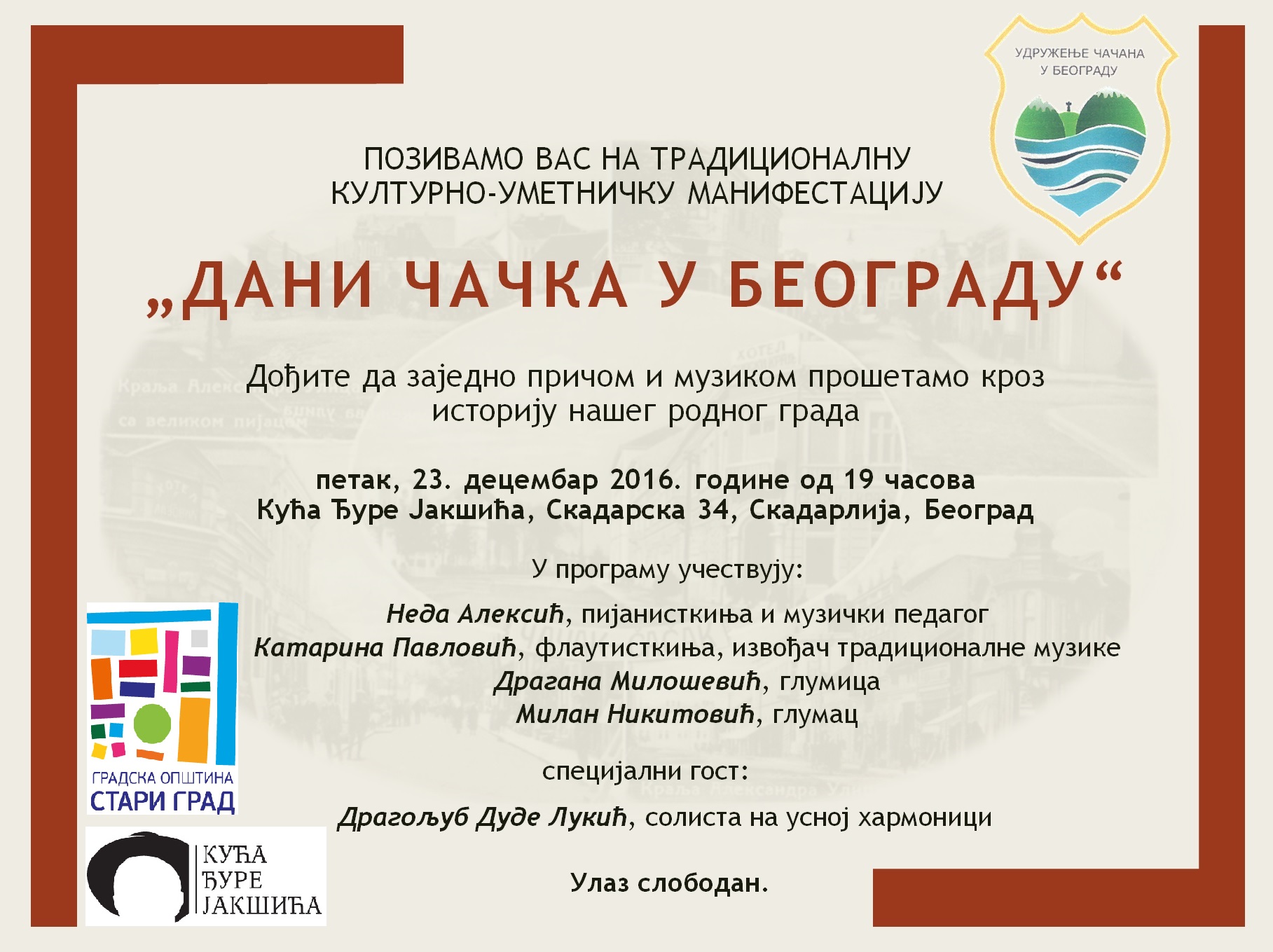Удружење Чачана у Београду традиционално сваке године средином децембра приређује културно уметничку манифестацију „Дани Чачка у Београду“. Манифестација је посвећена дану Чачка, 18. децембру, датуму када је Чачак под тим именом давне 1408. године први пут поменут у дубровачким архивима. Програм је замишљен као шетња кроз историју Чачка и чачанског краја, од најранијег праисторијског доба, па до данашњих дана, уз велику помоћ око историјске грађе господина Радивоја Бојовића, кустоса Народног музеја у Чачку. Исте вечери, по завршетку програма, у оквиру хуманитарне акције „Нека се свако дете радује Божићу“, биће организовано прикупљање гардеробе, хране и средстава за хигијену која ће бити достављена деци из мање имућних породица из нашег краја. Тиме ћемо им бар на тренутак улепшати наступајуће Божићне празнике и показати им да нису сами. Удружење посебно апелује на оне чланове који могу донирати половну дечију гардеробу која је у добром стању, да то заиста и учине. Нешто што се нама у датом моменту не чини битним неком другом може значити много. Организатори хуманитарне акције којој се прикључило Удружење Чачана у Београду су Коло српских сестара „Надежда Петровић“ из Чачка и фирма IVB Solutions.