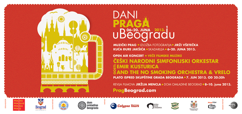 Велико нам је задовољство да Вас позовемо на свечано отварање изложбе фотографија „Музички Праг“ господина Јиржија Вшетечке. Изложба ће бити отворена у четвртак, 6. јуна, у „Кући Ђуре Јакшића“ (Скадарска 34) са почетком у 19 часова. Изложба ће означити почетак првих „Дана Прага у Београду“ у склопу којих ћете моћи да присуствујете и концерту на коме ће учествовати Чешки народни симфонијски оркестар, Емир Кустурица, The No Smoking Orchestra и група Врело, на платоу испред Скупштине Града Београда, у петак 7. јуна са почетком у 20:30 часова. Плакат: