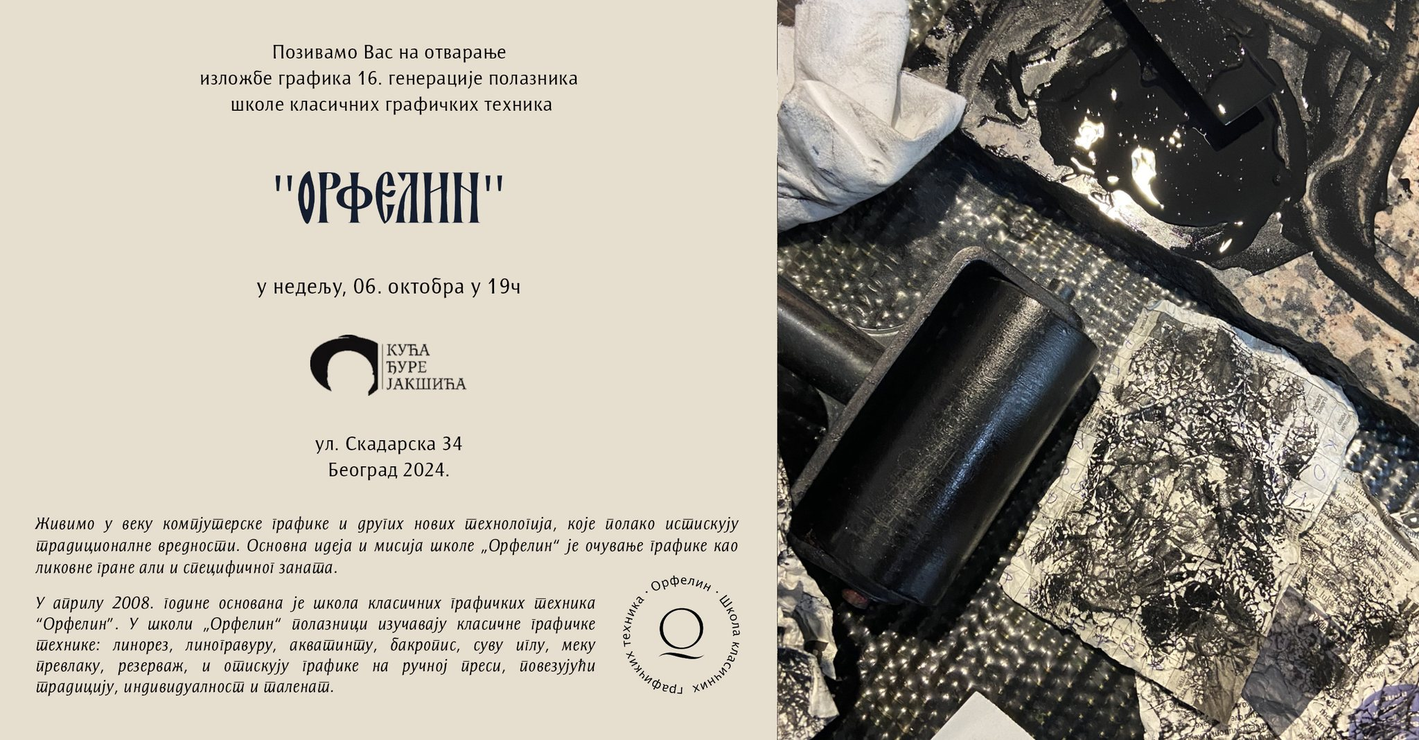 У недељу 6-ог октобра у 19 сати, сада већ традиционално, отварамо изложбу графика 16. генерације школе „ОРФЕЛИН“.