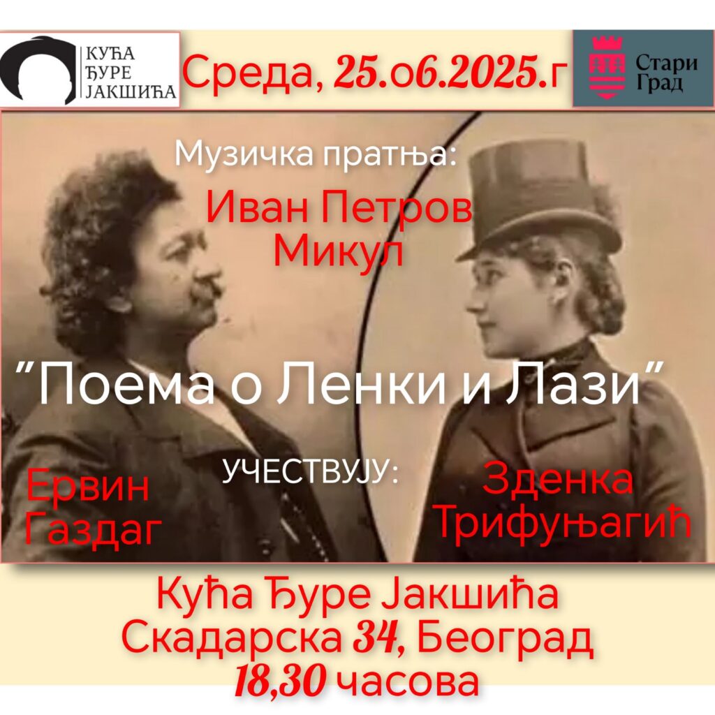 ПОЕМА О ЛЕНКИ И ЛАЗИ ће премијерно бити изведена у Кући Ђуре Јакшића и верујемо да ћете уживати док слушате делове из Ленкиног дневника, од дана када је упознала Лазу Костића па све до њене смрти и одломке из Лазиног дневника посвећених Ленки, који су прожети Лазином поезијом и песмама посвећеним Ленки.