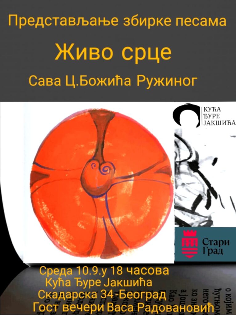 Јесењу сезону књижевних вечери у Кући Ђуре Јакшића настављамо са представљањем књиге поезије ЖИВО СРЦЕ, аутора Сава Божића Ружина, која ће се одржати у среду, 10-ог септембра.