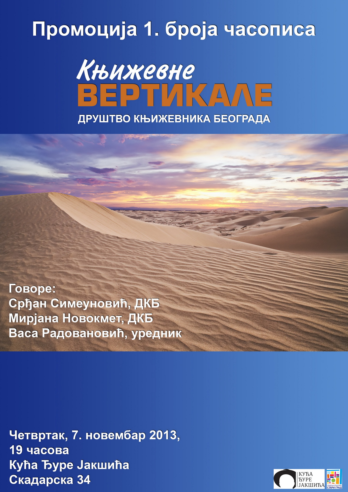 Срђан Симеуновић и Мирјана Новокмет из ДКБ-а, уз Васу Радовановића, уредника часописа, публици ће представити ауторе поезије, прозе, афоризама и есеја. За музичку вертикалу, задужена је Сандра Продановић, која ће отпевати арију ’’О Соле мио’’.