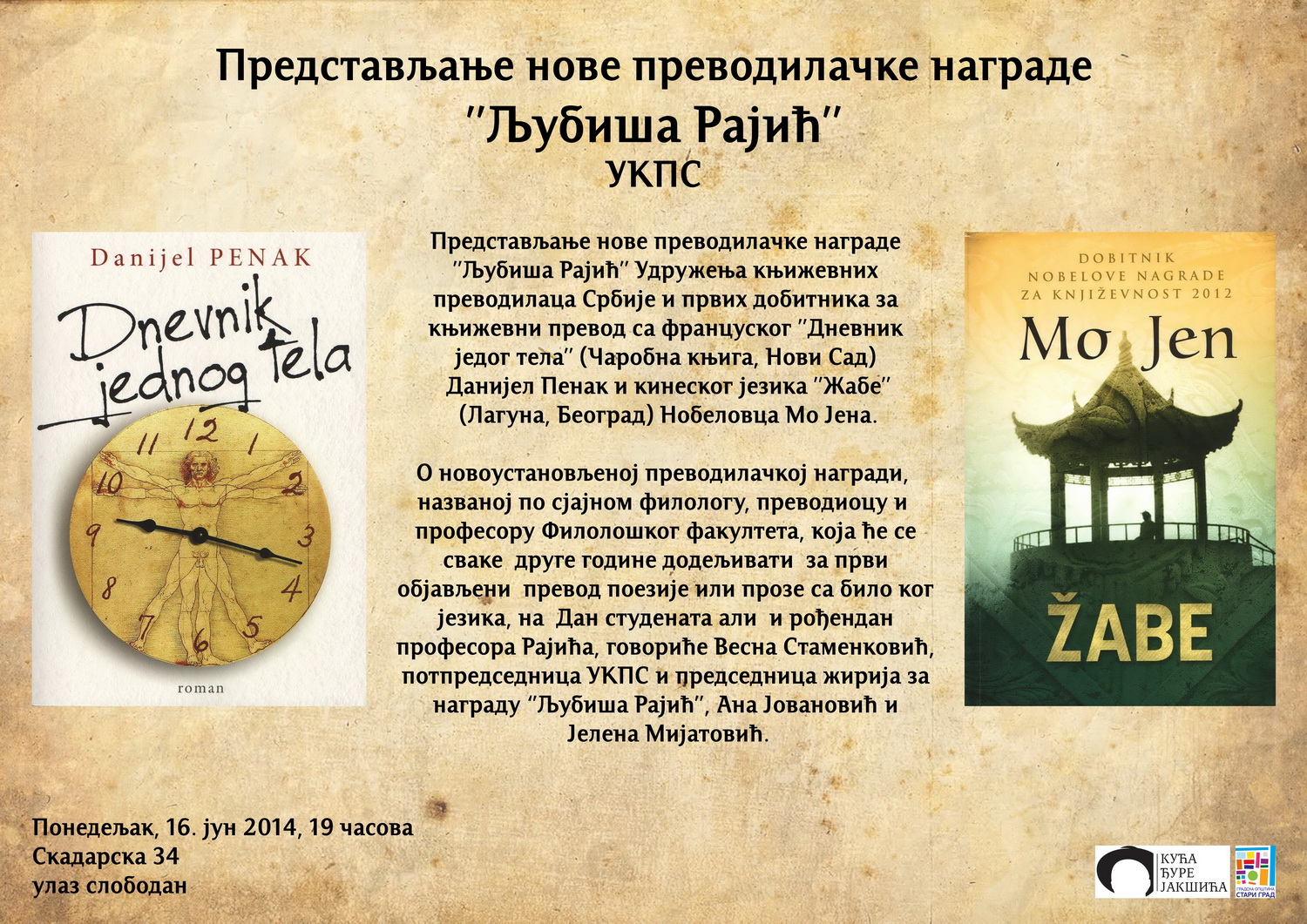 Представљање нове преводилачке награде ’’Љубиша Рајић’’ Удружења књижевних преводилаца Србије и првих добитника за књижевни превод са француског ’’Дневник једог тела’’ (Чаробна књига, Нови Сад) Данијел Пенак и кинеског језика ’’Жабе’’ (Лагуна, Београд) Нобеловца Мо Јена.