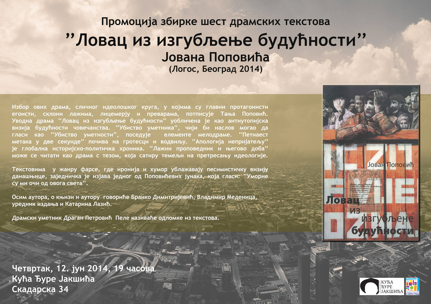 Избор ових драма, сличног идеолошког круга, у којима су главни протагонисти егоисти, склони лажима, лицемерју и певарама, потписује Тања Поповић. Уводна драма ’’Ловац из изгубљење будућности’’ уобличена је као антиутопијска визија будућности човечанства. ’’Убиство уметника’’, чији би наслов могао да гласи као ’’Убиство уметности’’, поседује елементе мелодраме. ’’Петнаест метака у две секунде’’ почива на гротесци и водвиљу. ’’Апологија непријатељу’’ је глобална историјско –политичка хроника. ’’Лажни проповедник и његово доба’’ може се читати као драма с тезом, која сатиру темељи на претресању идеологије.