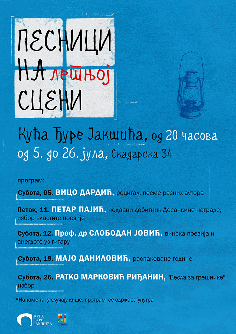 Као некада почетком седамдесетих година прошлог века, са прозора Куће Ђуре Јакшића и испред ње, песници ће током јула и августа, петком и суботом, пролазницима и гостима које доведу, уз музичку пратњу, говорити своје стихове. У оквиру летње песничке сцене у Скадарлији, од осам часова увече, прве јулске суботе наступиће Вицо Дардић, са поезијом разних аутора, а Петар Пајић представиће избор из своје поезије 11. јула. О стиховима у славу вину и анегдотама у вези са испијањем вина, уз певање и свирање, говориће следеће вечери, 12. јула проф. др Слободан Јовић. Мајо Даниловић представиће одабране стихове из збирке ’’Распаковане године’’ у суботу 19. јула . Избор из књиге ’’Весла за грешнике’’ Ратка Марковић Риђанина на програму су последње јулске суботе.