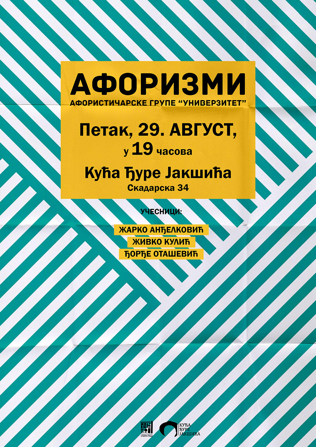 Три доктора наука,чланова афористичарске групе ’’Универзитет’’ Жарко Анђелковић, Живко Кулић и Ђорђе Оташевић, одржаће у петак, 29.08.2014. од 19 часова у Кући Ђуре Јакшића вече својих афоризама и правдоризама. Скадарлијска публика први пут ће имати прилику да чује бројне афоризме расуте по књигама ових аутора, у Оташевићевој ’’Енциклопедији афоризама’’, ’’Дриблингу духа’’ и ’’Антологији српске сатире’’, књигама Жарка Анђелковића, који се бави правним афоризмима суи генерис, названих правдоризмима – ’’Свако за размишљену’’, ’’Стефани’’ и ’’Опет шапућем’’, као и Кулићевим књигама: ’’У кожи свог народа’’, ’’У канџама демократије’’ и ’’Незаштићени сведок’’.